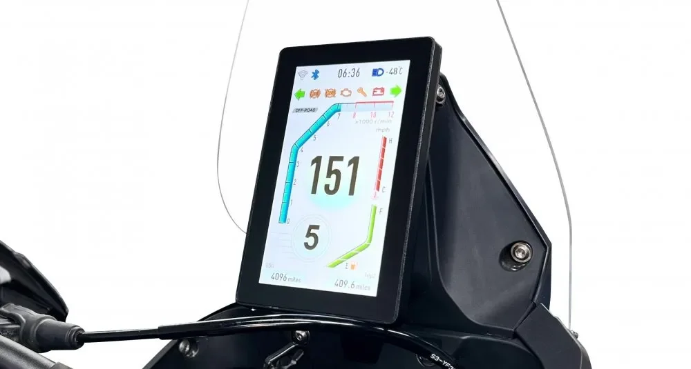 Full smartphone connectivity, including navigation, day/night modes, adjustable brightness and an ambient temperature sensor. Modern cockpit, old-school riding.